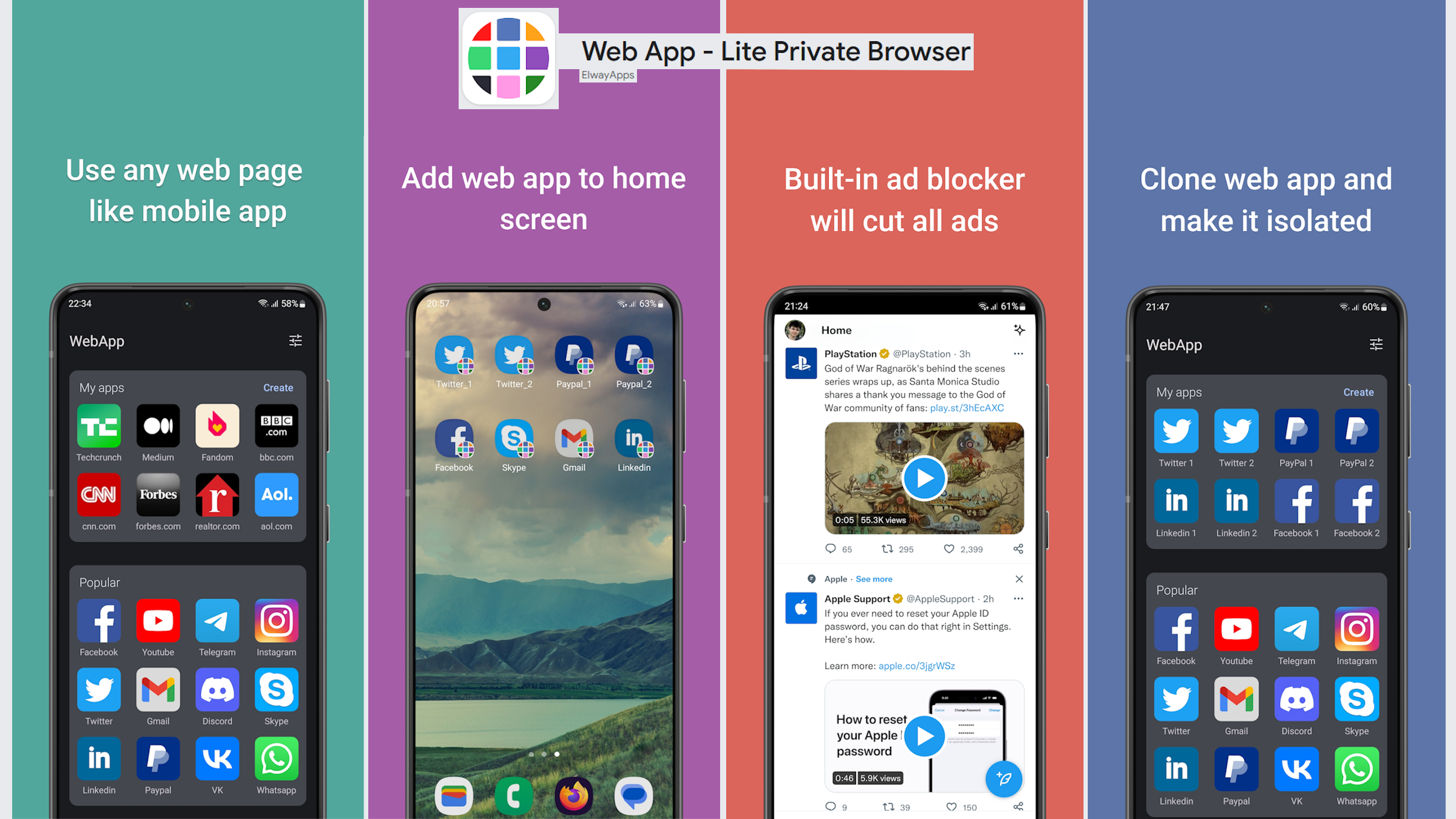 Ο Web App – Lite Private Browser είναι ένας browser ειδικά σχεδιασμένος για να μετατρέπει οποιαδήποτε ιστοσελίδα σε εφαρμογή. Συγκέντρωσε σε μια μόνο εφαρμογή το Facebook, Instagram, τις εφαρμογές που κάνεις online αγορές, τα Clouds και ότι άλλο μπορείς να φανταστείς.
